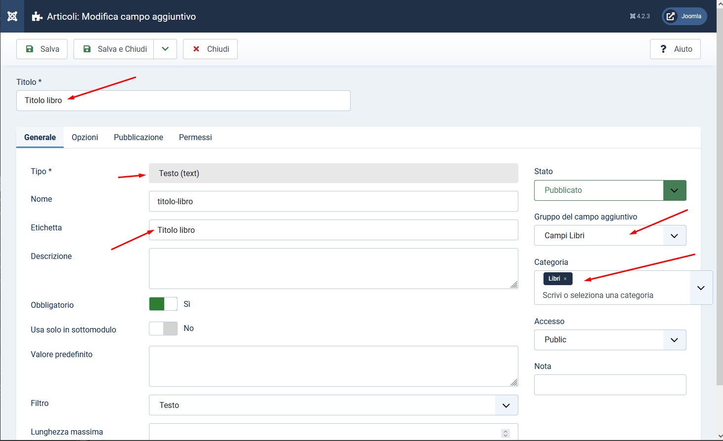 Procedere così anche per tutti gli altri campi, quanti ne serviranno per realizzare una scheda completa di un libro. Per esempio: Autore, Editore, Immagine copertina, ISBN, ecc, scegliendo le tipologie corrette per il contenuto a cui è destinato ogni campo. - Creare l’articolo per la scheda per il libro